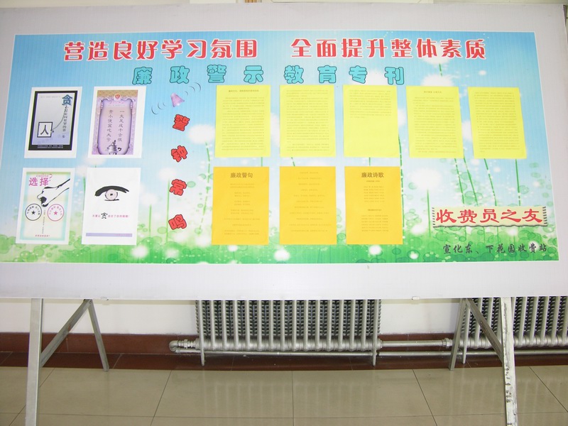 為鞏固“干部作風(fēng)建設(shè)年”活動第一、二階段取得的成果,充實“干部作風(fēng)建設(shè)年”的活動內(nèi)涵,在活動開展的第三階段,宣化東、下花園收費站結(jié)合收費工作每天與金錢打交道的特點,利用《收費員之友》宣傳展板編制了“廉政警示教育”專欄。