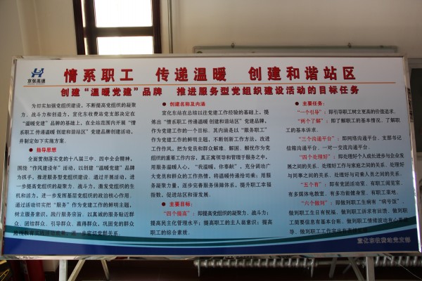 展板涵蓋了創(chuàng)建活動的指導(dǎo)思想、創(chuàng)建名稱及內(nèi)涵、主要目標(biāo)任務(wù)等方面的內(nèi)容。提出了“情系職工 傳遞溫暖 創(chuàng)建和諧站區(qū)”的創(chuàng)建口號并對其內(nèi)涵進(jìn)行解釋說明。制定了“四個提高”的目標(biāo),即提高黨組織的凝聚力、戰(zhàn)斗力;提高民主化管理水平;提高職工的主人翁意識;提高職工的綜合素質(zhì)。確立了創(chuàng)建活動的六個主要任務(wù),分別為“一個引導(dǎo)”:即引導(dǎo)職工樹立更高的價值追求;“兩個了解”:即了解職工的基本情況、了解職工的基本訴求;建立“三個溝通平臺”:即網(wǎng)絡(luò)溝通平臺、支部書記信箱溝通平臺、一對一交流溝通平臺;“四個處理好”:即處理好個人成長進(jìn)步與企業(yè)發(fā)展之間的關(guān)系、處理好工作與家庭之間的關(guān)系、處理好與同事之間的關(guān)系、處理好與司乘人員之間的關(guān)系;“五個有”:即有黨團(tuán)活動室、有職工閱覽室、有多媒體電教室、有多功能健身室、有職工菜地;“六個做到”:即做到職工生病有“病號飯”、做到職工生日有祝福、做到職工訴求有回饋、做到職工簡要信息有基本臺賬、做到職工情緒波動有心里疏導(dǎo)、做到職工工作突出有表揚獎勵。