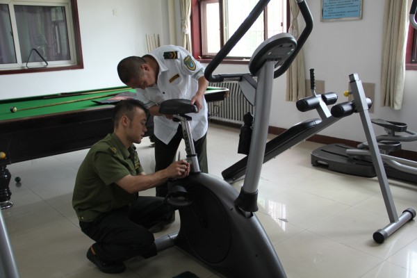 6月17日,;劬、李淵兩名同志發(fā)現(xiàn)健身房部分健身設施出現(xiàn)螺絲松動現(xiàn)象,便自發(fā)找來維修工具對設施進行維修保養(yǎng)。兩人邊摸索邊修理,將因螺絲松動而不能使用的健身自行車重新修好,隨后又對其他健身器材進行加固保養(yǎng),保證了設施正常使用。
