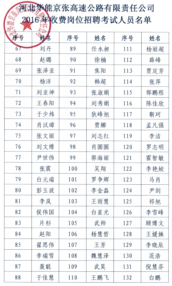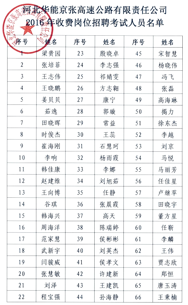 2016年收費(fèi)崗位招聘考試人員名單