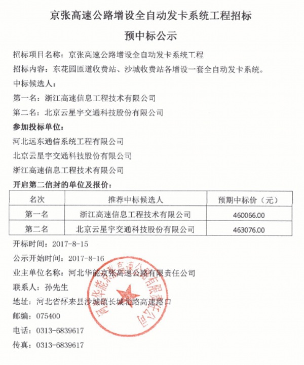 京張高速公路增設(shè)全自動(dòng)發(fā)卡系統(tǒng)工程招標(biāo)預(yù)中標(biāo)公示