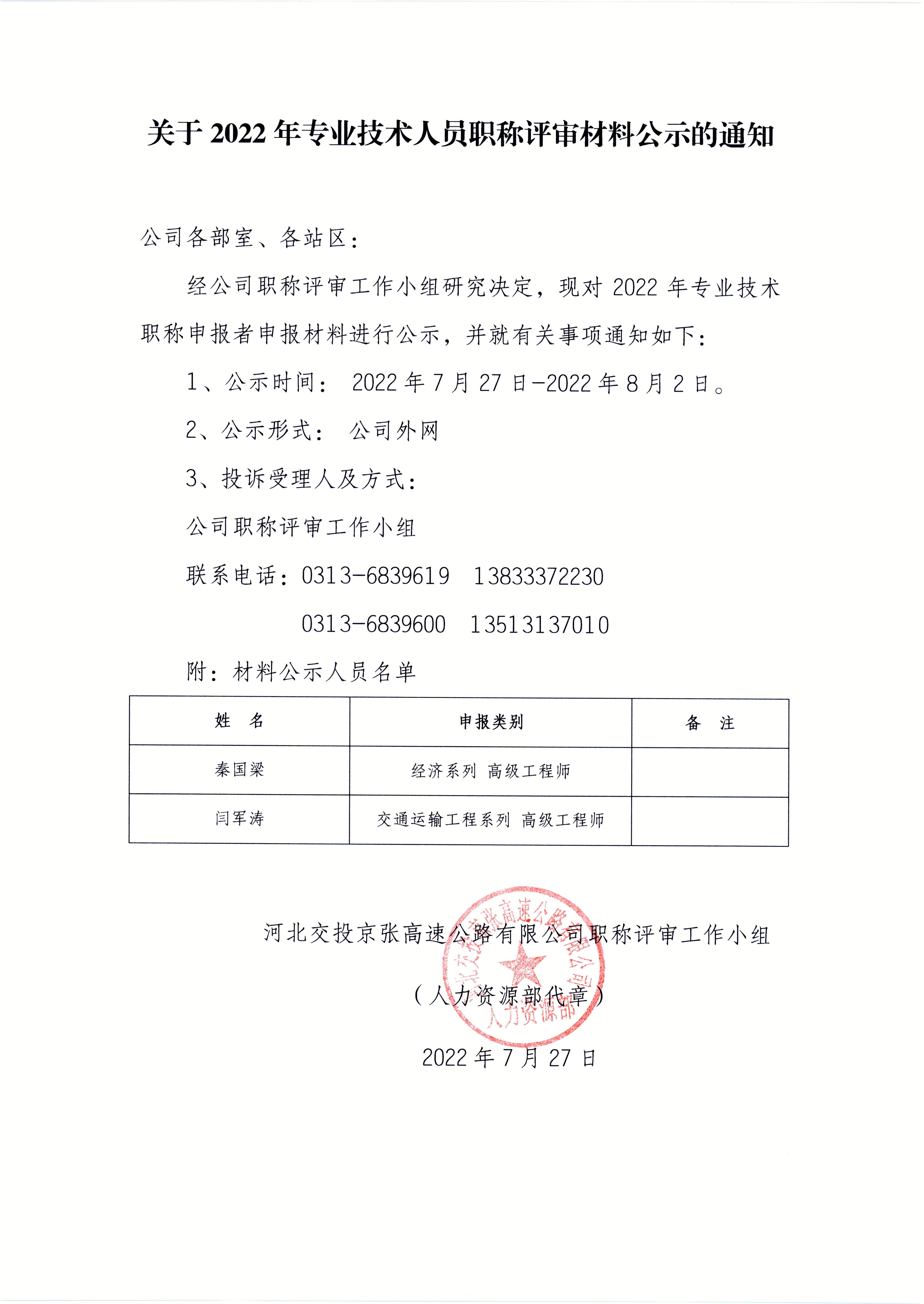 關于2022年專業(yè)技術(shù)人員職稱申報材料公示的通知
