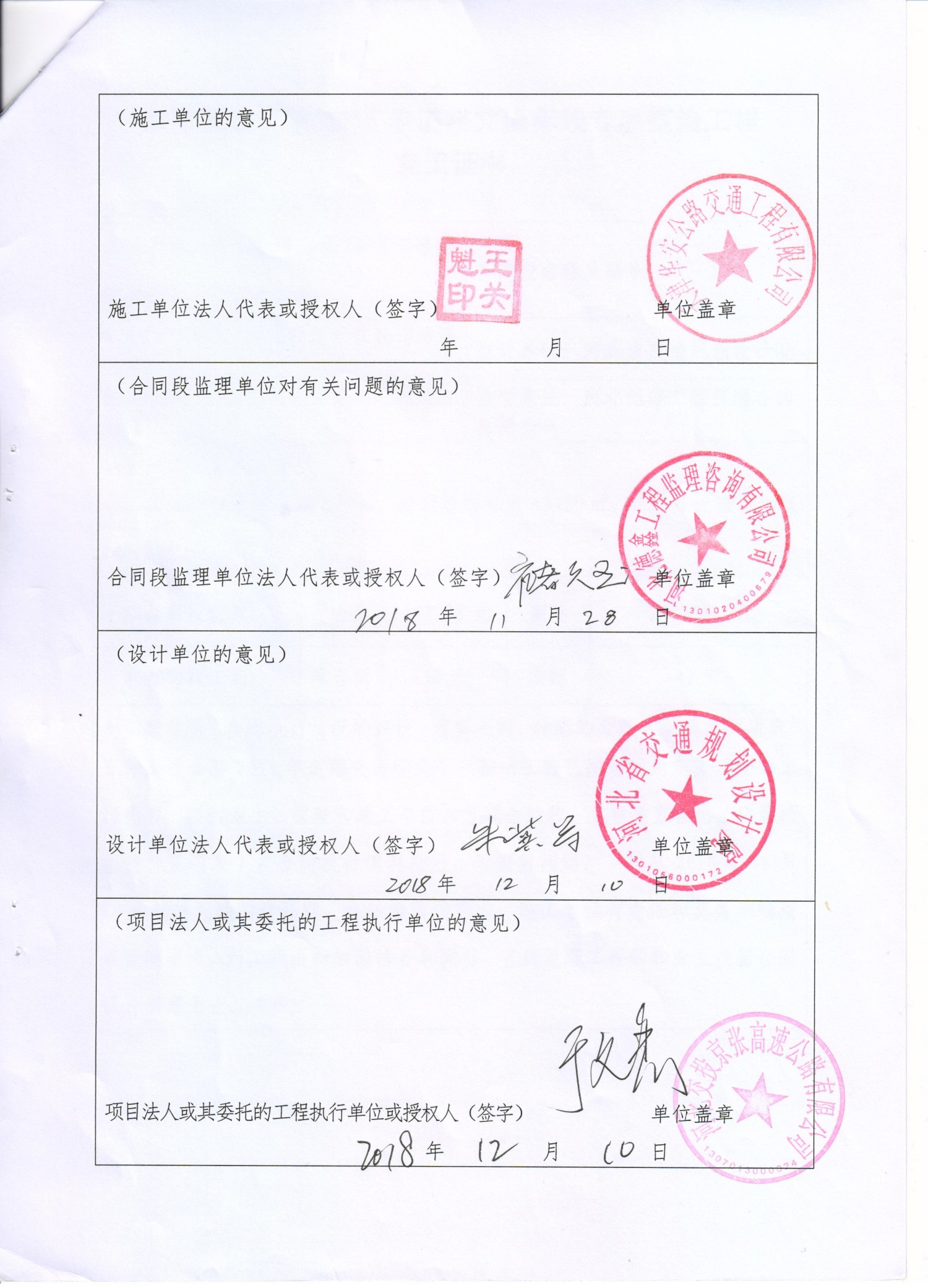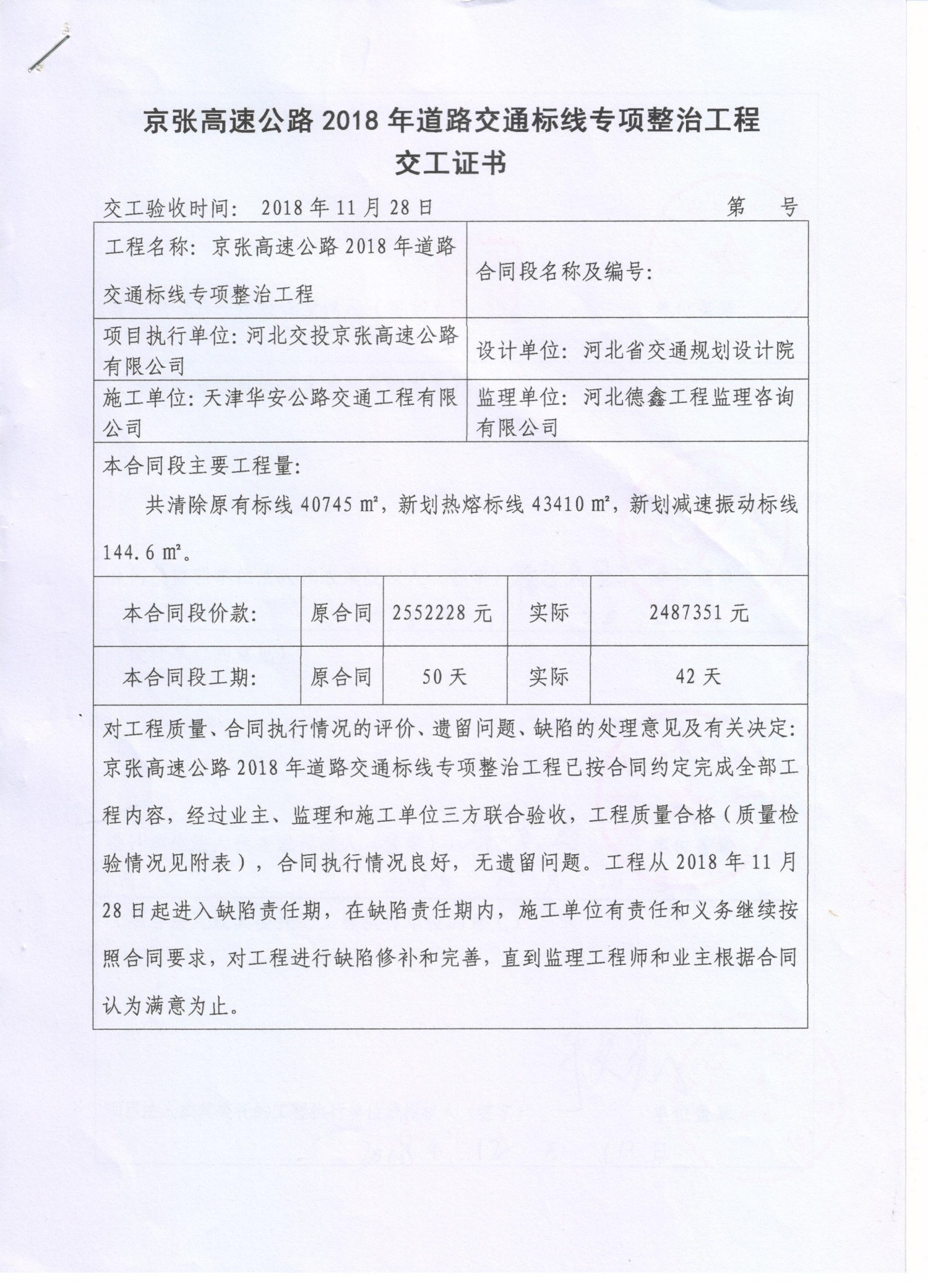 京張高速公路2018年道路交通標(biāo)線專項(xiàng)整治工程交工證書(shū)